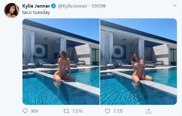 凯利-詹娜分享泳装照 并配文:taco Tuesday